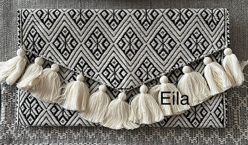 New Eila handcrafted embroidered clutch purse with off white tassels